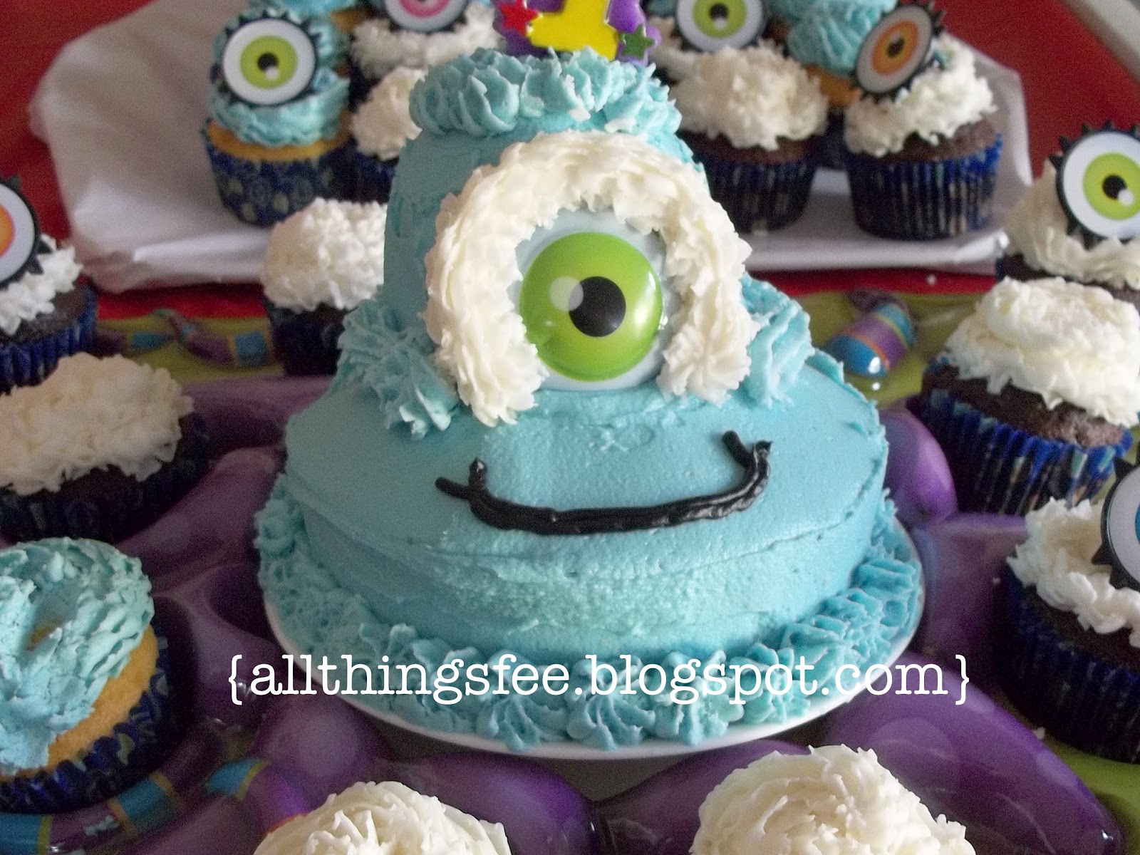 The rest of the party was full of primary colored balloons, table clothes, plates, cups etc. I even hot glued eyeballs on toothpicks and stuck them into the food!